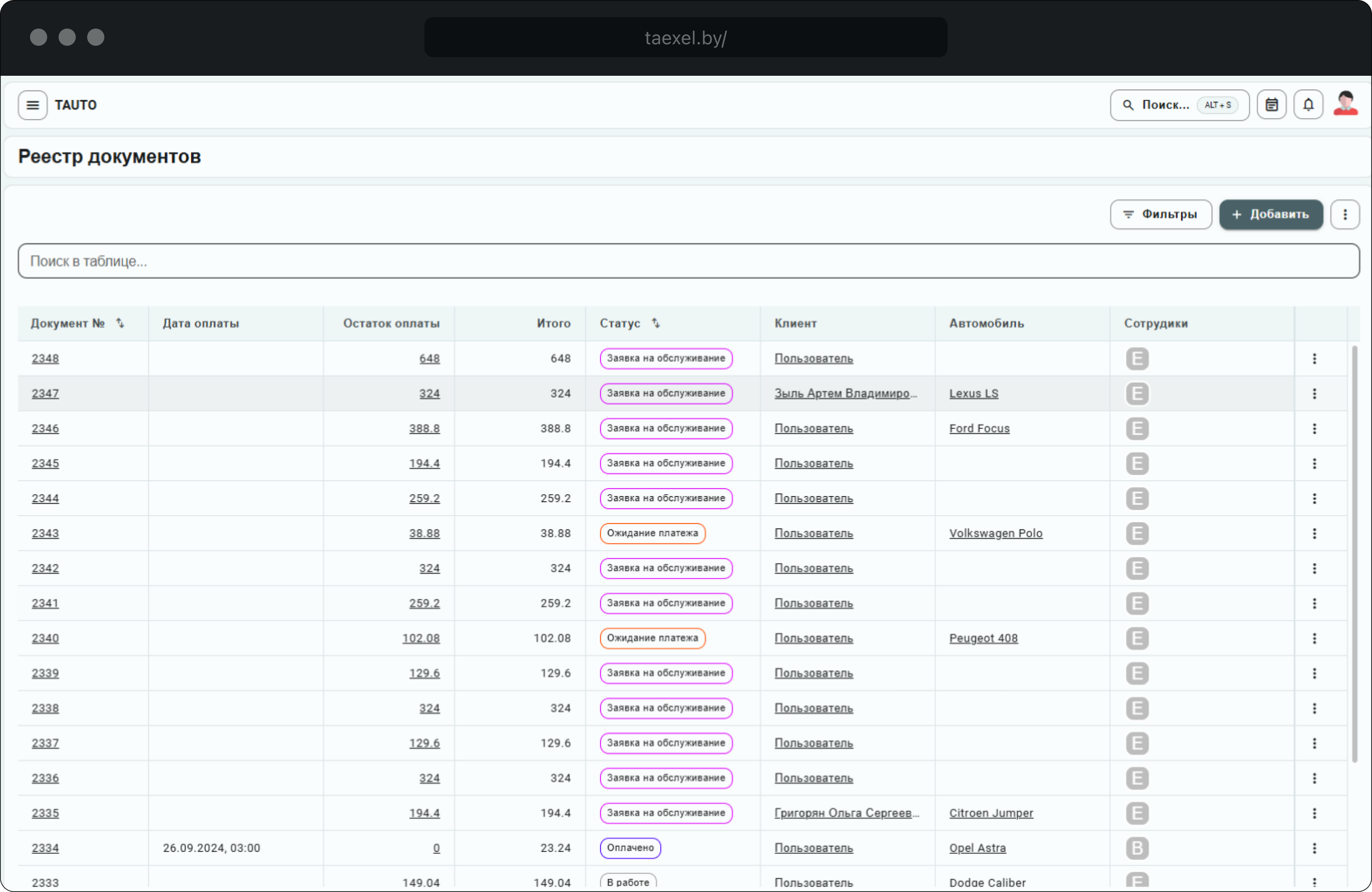 Прозрачность: ваши клиенты могут просматривать все работы и услуги, выполненные вашим сервисом в мобильном приложение TAEXEL Прогнозирование затрат на обслуживание через функционал приложения TAEXEL. Это сведет к минимуму даже мелкие внезапные поломки авто.