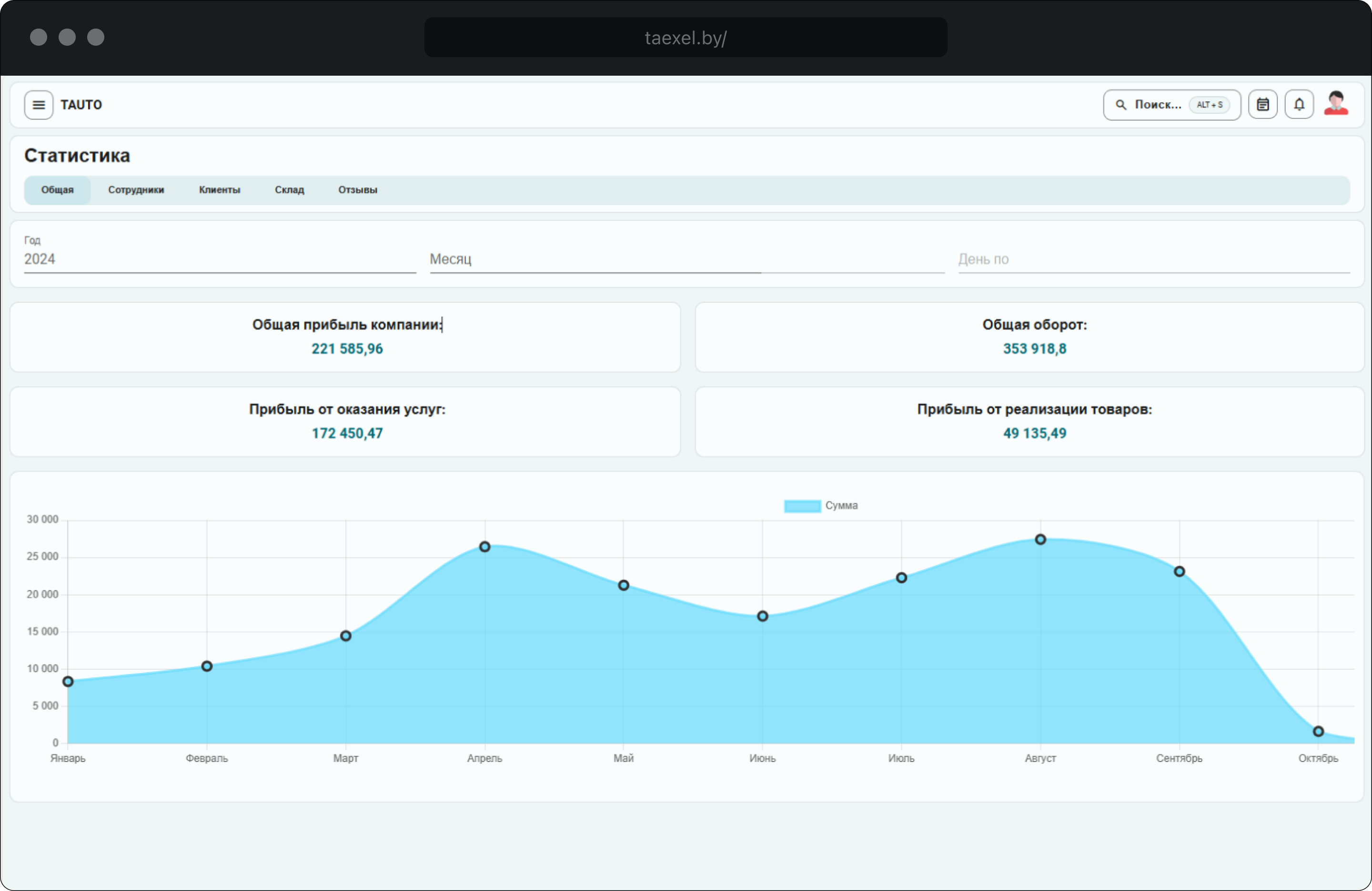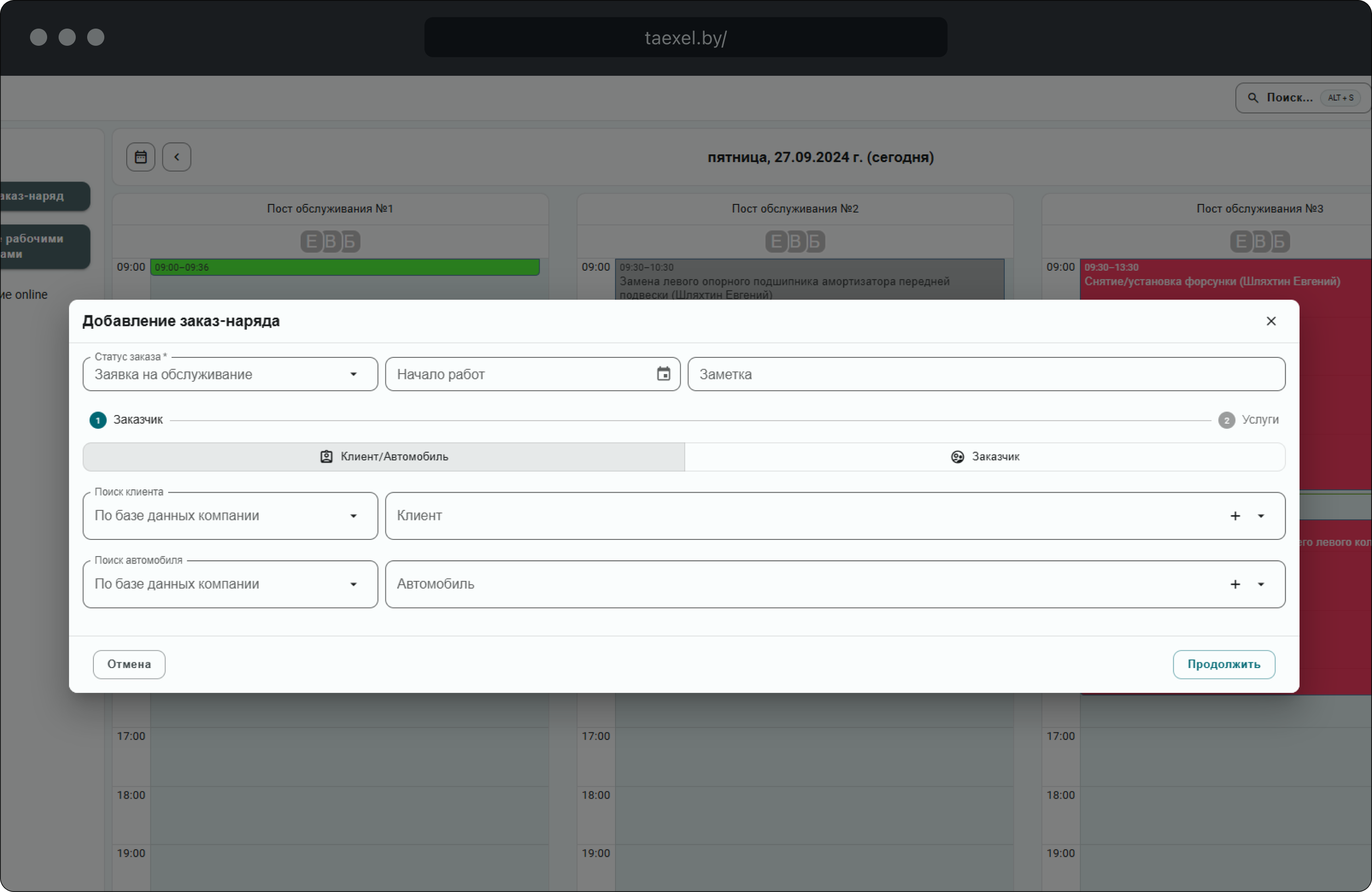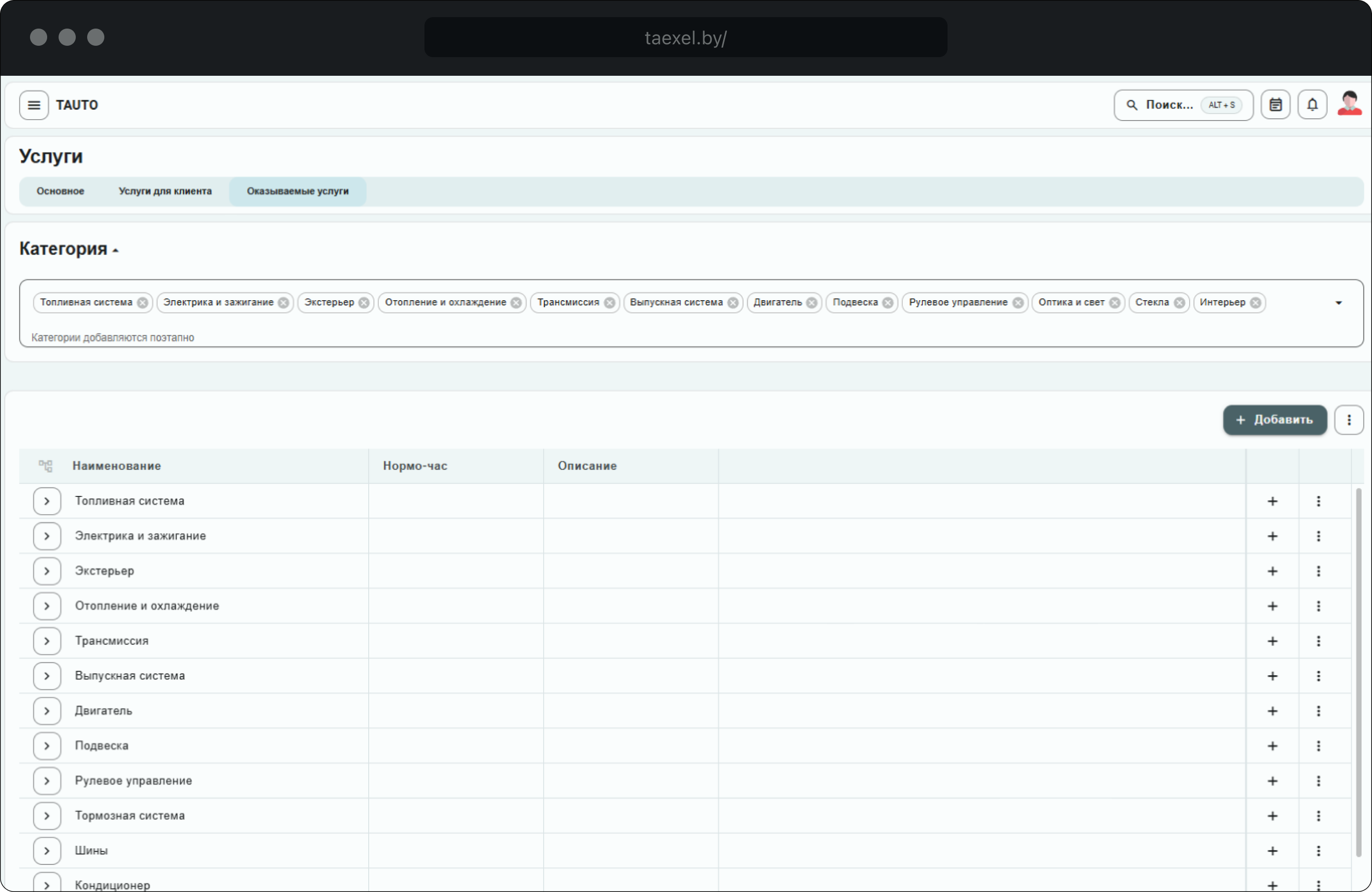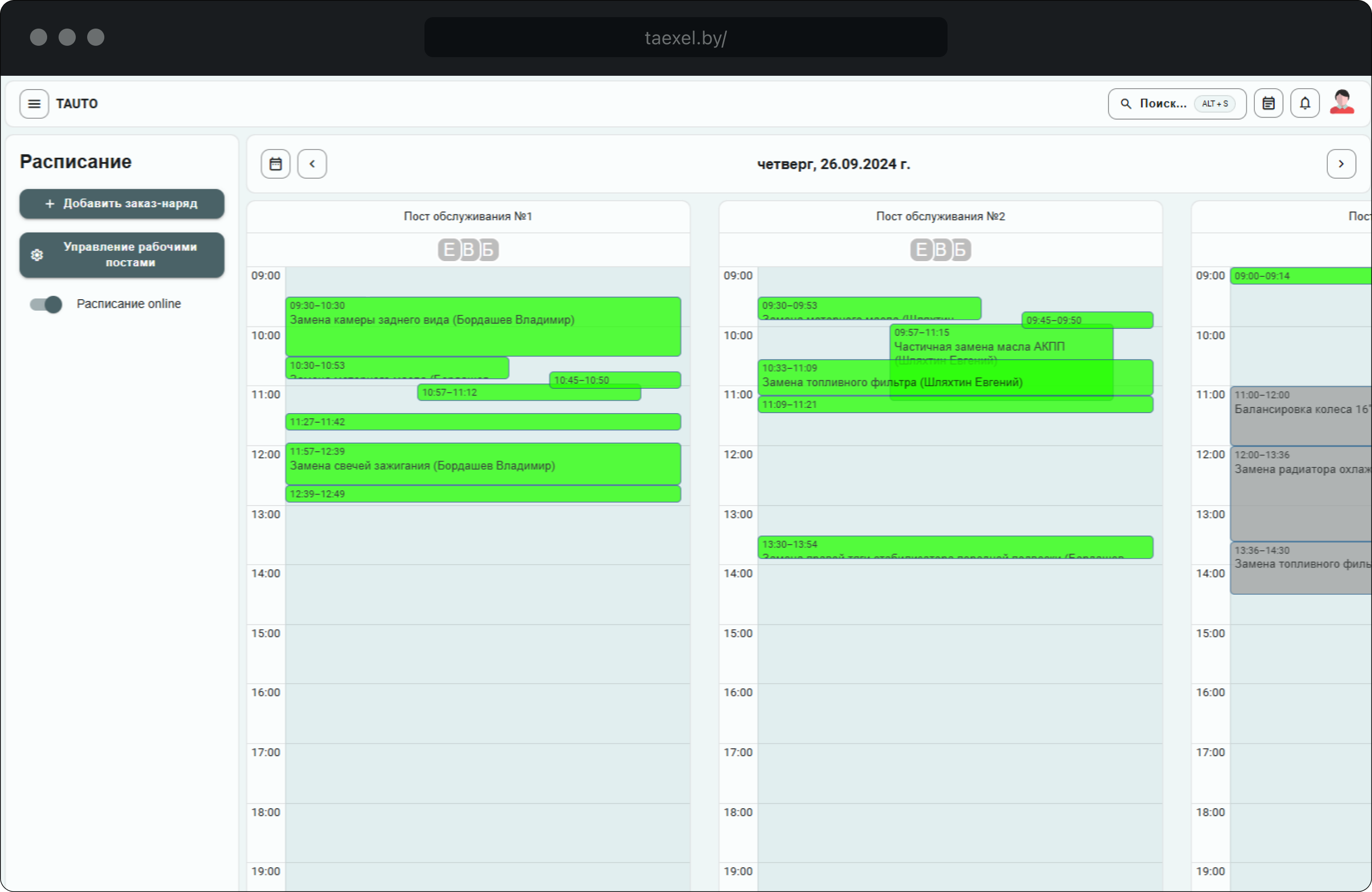 Базовый - создание заказ-наряда - ведение историю обслуживания клиента и складского учета - составление плана работ по клиентам - видеть базовую статистику вашего предприятия - добавлять/удалять сотрудников Расширенный - расширенная статистика - добавление более трёх сотрудников - в приложении: отображение в акциях, смс оповещение - клиенты получают возможность онлайн записи на обслуживание - кампания отображается на картах приложения TAEXEL - push-уведомления для информирования клиентов через мобильное приложение